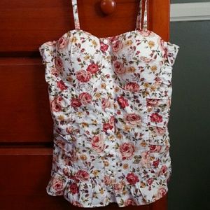 Cute vintage top perfect with a cardigan if cold. Does not open buttons are sowed on. The back can stretch out for perfect fit. Only worn once.