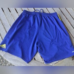 Comfortable and stylish men's soccer shorts in blue with yellow accents. Spain kit, some wear but overall good condition. Perfect for athletic activities or casual wear.