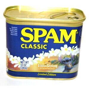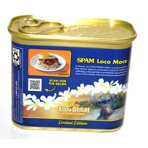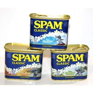 Enjoy the unique blend of flavors with this limited edition Disney Lilo & Stitch, Yellow themed Stitch doing the Hula, Green themed Stitch doing the Shaka sign, and Blue themed Stitch Surfing the waves, canned Spam. This collectible lot includes three 12oz cans of this delicious and fun-themed canned meat, perfect for those who love Disney and want to add a touch of Hawaii to their meals.