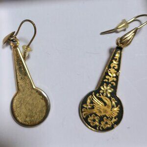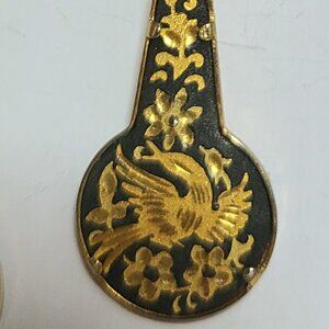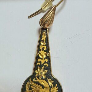 Spanish Damascene Teardrop Earrings with Birds and Vines -- Vintage & Pierced