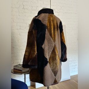 Remarkable vintage Spanish shearling coat with a patchwork diamond pattern in various shades of brown leather. This coat can be worn with the shearling on the inside or the outside; the shearling itself is richly saturated and textured. There is evidence of removable shoulder pads on the shearling side, but no shoulder pads are included, and the narrow velcro strips can be removed, if desired. Button closure with a stand collar and pockets at each side.