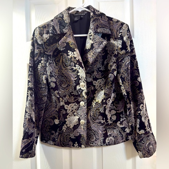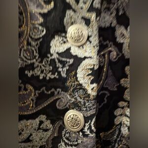 This Snapper blazer showcases a luxurious black and gold metallic brocade pattern, offering a sophisticated and elegant look. The tailored fit and classic lapel collar make it a versatile choice for formal occasions. Its hip-length cut adds a touch of modernity to this timeless piece.