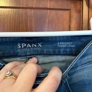 EUC pair of 5 Pocket Skinny Crop Jeans from Spanx in a size 29. These are a true pair of jeans that button and zip up. Nice medium wash. No puckering of the elastic and no inner thigh wear as pictured. No stains or flaws!