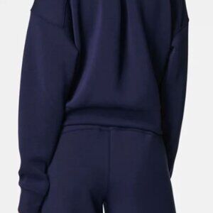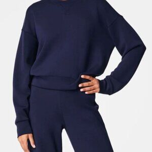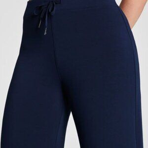 Gorgeous Spanx AirEssentials set in Timeless Navy. Crewneck is size small. Pant is the wide-leg style and size small TALL (33.5" inseam). They are mid-rise and have a "contoured back for the most flattering rear view." Material is 47% Tencel Modal, 46% Polyester, 7% Elastane. Care instructions: Machine wash inside out in cold, gentle cycle. Do not use fabric softener. Tumble dry low. Low iron if needed. Or dry clean.