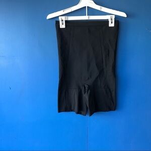 Tunic covering just below the bustling with part of cheeks showing Seamless,soft, satin fabric in good used shape does have some wear but not very noticeable small pin hole on left side just below the hem line