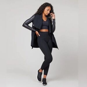 Ponté jersey lends sott structure to this lightweight SPANX wrap jacket. Faux leather trim adds a little edge to the convertible silhouette. NWT