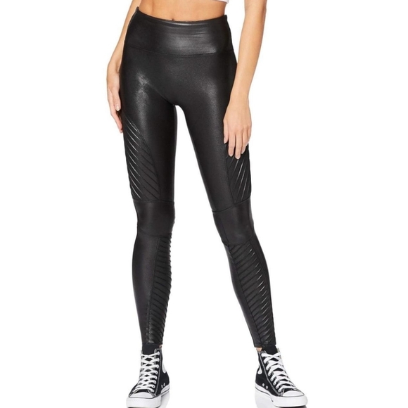 Spanx Faux Leather Moto Leggings. These are high-waisted leggings that feature a faux leather finish and ribbed "moto" style panels on the thighs and knees. The leggings are designed with a contoured power waistband for tummy shaping and are made from a blend of nylon and elastane with a polyurethane coating.