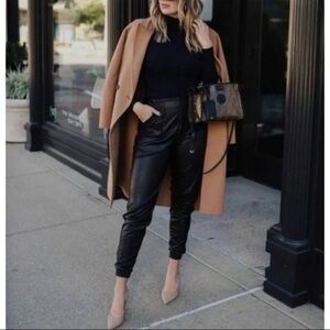 Very flattering faux leather joggers by SPANX. Sleek and stylish design. Perfect for versatile wear. Spanx vegan leather stretch joggers. Flat bulk-free front. Hidden tummy control panel. Functional front pockets.
