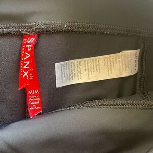 These black spandex full length leggings are by Spanx. They have a stomach support high waist panel. The pull-on leggings feature black mesh like faux leather panels on the lower sides of the leggings. They are a women’s size medium. Fantastic condition!