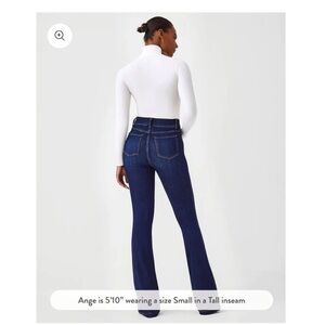Spanx jeans, Spanx flare jeans, high-rise jeans, stretch denim, slimming jeans, sculpting jeans, shaping jeans, flare leg jeans, Spanx denim, tummy control jeans, women's flare jeans, dark wash jeans, flattering jeans, body-sculpting jeans, Spanx pants, high-waisted jeans.