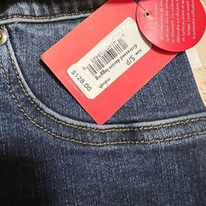 Features: ShapewearSpanx tummy control technology pull on jeans with functional back pockets and elastic waist band. Some manufactured torn details throughout for a contemporary look.