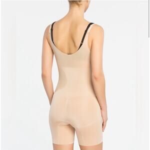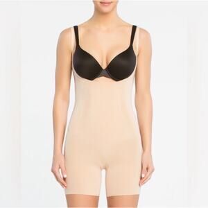 Spanx Bodysuit Open Bust Mid Thigh Shapewear Slimming Thick Adjustable Straps Tan Cream