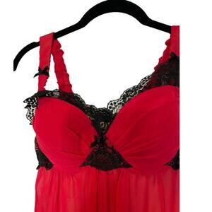 ✿ Features: Red lace lingerie nightie with black lace trim. Built in size 32 D bra top over a lined mini dress.