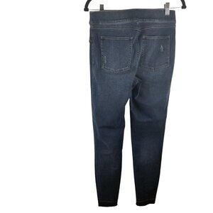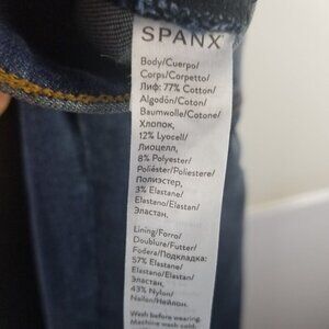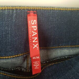 Spanx distressed ankle women's medium wash jeans size medium. 77% Cotton, 12% Lycell, 8% Polyester, 3% Elastane. Elastic waistband. Waist 14.5", Rise 10", and Inseam 25". Good pre-owned condition.