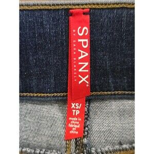 The product is a pair of Spanx distressed skinny jeans in a women's size XS with a medium wash denim. These jeans feature a pull-on closure, mid-rise fit, and a 27-inch inseam. They are made from a cotton blend fabric with added stretch for comfort and slimming effect. The jeans are accented with fringe and a logo, and they have a solid blue color. Perfect for year-round wear, these jeans can be machine washed and are ideal for a variety of styles from hipster to preppy.