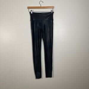Features: Black faux leather leggings, medium compression, shaping waistband, center free seam, high waisted, dress up or down
