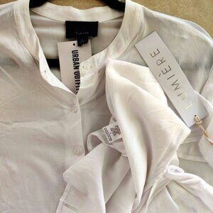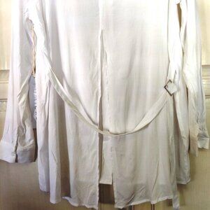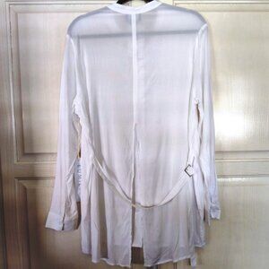 -NWT Urban Outfitters Lumiere Semi Sheer, High Low, Long Sleeve, Band Collar, Adjustable Back Belt for Fit, Back Center Slit (fishtail), Button Down in White, Sz Large, Retail $42. Approx measurements taken lying flat and unstretched - PTP 22", Waist 23", Sleeve 25", Length Neck to Short Hem 30.5", Neck to Long Hem 34.5". 98% Rayon, 2% Spandex. Hand wash cold, line dry, NO iron.