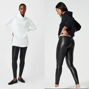 Bestselling Spanx faux leather leggings in classic black. These sleek, high-waisted leggings offer signature shaping support and a flattering sculpted silhouette. Made with a coated finish that gives the look of leather with the comfort of stretch fabric.