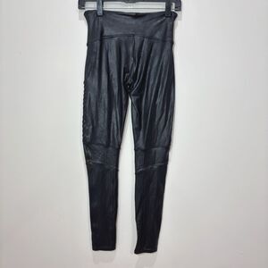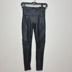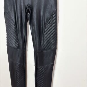 Features: Spanx Women Faux Leather Moto Leggings. Black. Pleated. Stretch, Shaping, Elastic Waist.