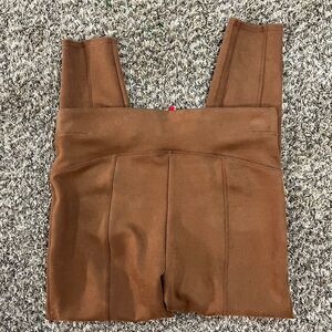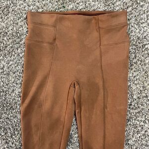 SPANX brand faux suede leggings in the color Rich Caramel. High waisted. Tag size 1X plus size. Flat waist measurement is 18 inches. Inseam measurement is 28 inches. Rise is 12 inches. Excellent preowned condition!