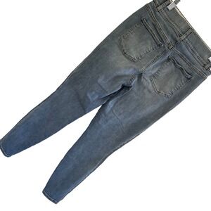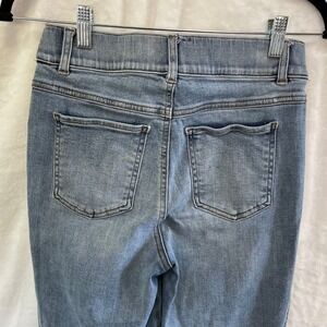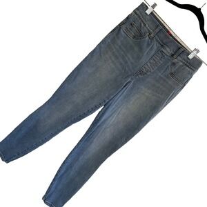 Spanx Jeans Blue Light Wash High-Waisted Pull-On Skinny Jeans, size S/M??? Tag is absent. Please refer to measurements. The pull-on design offers a smooth, comfortable fit, and the high waist provides a flattering silhouette. In excellent pre-owned condition.
