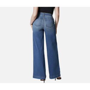 These pull on Spanx jeans are a stylish and retro addition to any woman's wardrobe. With a wide-leg design and a vintage-inspired indigo blue color, they exude a hippie, bohemian vibe. Made from a comfortable cotton blend denim, these size jeans feature a seamed front and a high rise for a flattering fit. Machine washable and suitable for all seasons, they are perfect for women looking to make a statement with their fashion choices.