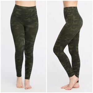 Embrace your active lifestyle with these Spanx Dark Green Camo Seamless High-Waisted Leggings. Featuring a double-layer waistband for comfortable compression, these leggings provide seamless shaping that firms all around. Made with matte yarn and a twill knit construction, they offer excellent coverage, a great fit, and a stylish camouflage design. Perfect for the gym, yoga, or casual wear!