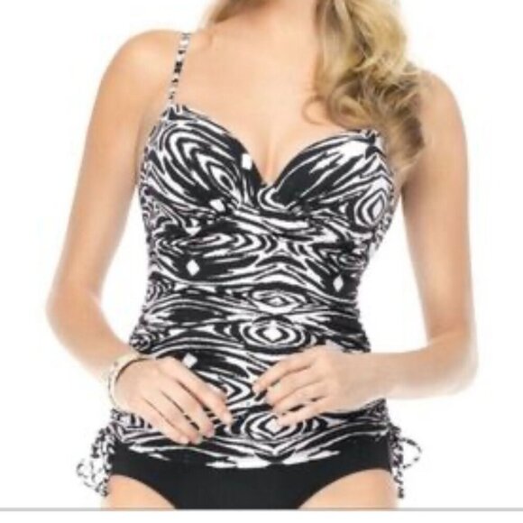 Spanx Love Your Assets Ruched Tankini Swim Top Black & White Abstract Print XL