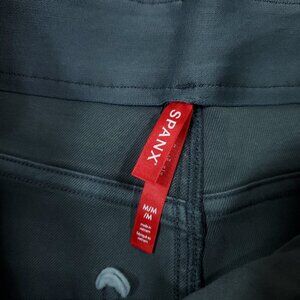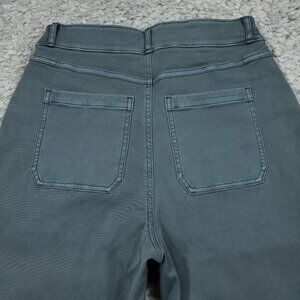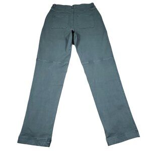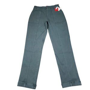 Women's Spanx Stretch Twill Straight Leg high rise pull on elastic waist pants in Hazy Blue Gray (can also have a slight green tint depending on lighting). New with tags. Style number 20399t. Women's size medium tall, real measurements shown in photos with pants laid flat: