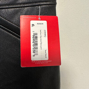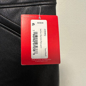 The item is a pair of Spanx 'leather-like kick flare pant' in luxe black, size M/M Petite. It is new with tags. The pants are made of a faux leather material. The pants feature a mid-rise waist, faux front pockets, and a flared leg opening. The pants are free of any visible imperfections.