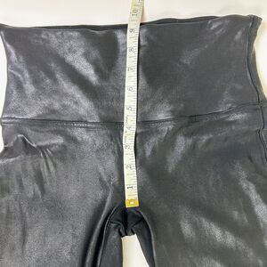 Spanx shape faux leather liquid leggings in black with a beautiful sheen finish. Faux Leather that flatters. This best-selling style by Spanx features sleek, smoothing faux leather fabric that shapes and lifts and a contoured Power Waistband for core compression. Made of a sleek and smoothing 87% Nylon/13% Spandex faux leather fabric shapes and lifts, with a center seam and high waisted design with medium compression, as well as a contoured design for a perky rearview. These leggings are perfect to dress up or down for any occasion. Style 2437. Excellent used condition. Women's size L large, measurements pictured, lots of stretch.