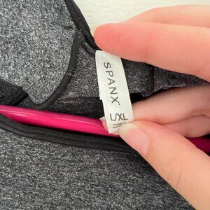 Looks absolutely insane on the hanger but is a Spanx smoothing long sleeve top meant to be worn under dresses or sweaters. Sheer gray. Very wide scoop neck works well for hiding with lots of necklines.