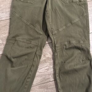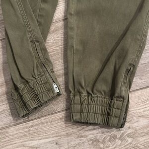 Spanx Stretch Twill Cargo Jogger Olive Green. Medium. Elastic zippered cuffs. Topstitched panels and knee darts. Pull on. No fabric content tag. Rise approximately 11 inches. Inseam approximately 29 inches. Nonsmoking home.