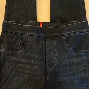 Spanx woman’s dark wash jean leggings. Features elastic waistband, faux fly, faux front pocket, 2 functional back pockets, flat front.