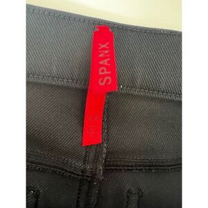 A pair of Spanx jeggings offering both style and comfort. These pants feature a pull-on design, eliminating the need for zippers or buttons, ensuring a smooth and flattering silhouette. The design incorporates functional front pockets and classic back pockets, adding to the overall look.