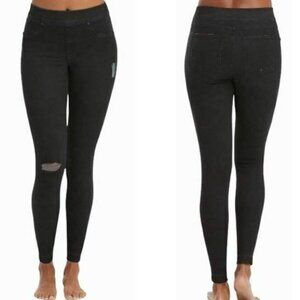 Spanx Faded Black High Rise Ripped Distressed Skinny Slim Jeans gently used but overall great condition. Raw ankle hemline. Has comfortable but firm stretch throughout. No zipper or button, it is pull on style.