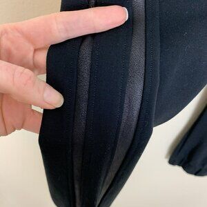 Rayon nylon spandex. Ponte knit fabric with faux leather side stripes.