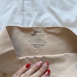 The Spanx women's size medium tan shorts are a comfortable and shapely option for achieving tummy control and a smooth silhouette.