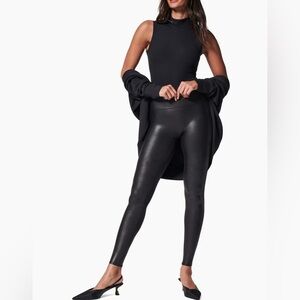 Spanx black spandex faux leather tights/leggings. Size large, good shape no holes or stains! Perfect pair of black leggings, great for yoga or low to medium impact workouts! All black with a light sheen to them.