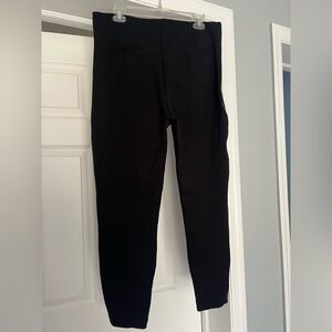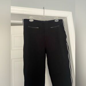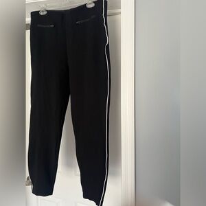 Streamlined black joggers from SPANX with contrasting white side piping. Stretch fabric for a flattering, comfortable fit. Zippered front pockets secure small items. Sleek silhouette works for casual and athleisure outfits. Super comfy! Measures 17” across waist, 13” rise and 26” inseam.