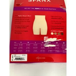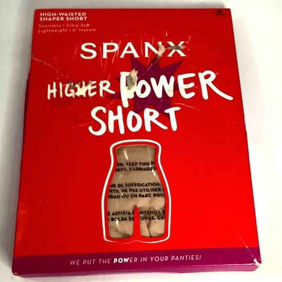 Spanx seamless highr power shorts provide all day shaping. If you wear as underwear, you have no visible panty lines. Lightweight,. Comfortable. High waist sits under the bust for shaping ans support. No slip silicone strip helps them stay in place. Wearing these feels like a firm hug. High waisted-mid thigh. 54%nylon 46% spandex. Hang dry. Fits well if you put it on first then put placing your bra over the waistband. Comfortable. soft. Lightweight. Spanx are new, box is worn B145 size M