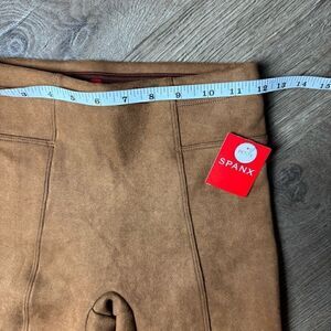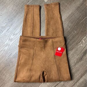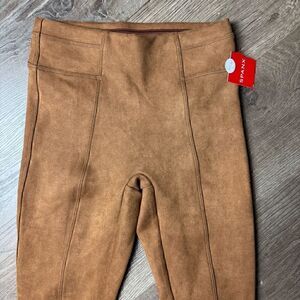 Style Number: 20322 Your next night-out outfit will be effortless wearing the Spanx Faux Suede Leggings. Seamed, pull-on leggings. Slip hand pockets at front. Elastic waistband. Slim fit. 90% polyester, 10% elastane. Lining: 80% polyester, 20% elastane. Machine wash, tumble dry.