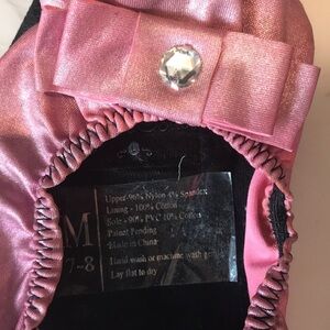 Stylish comfort for your feet! Jeweled bow ballerina Flats with a matching wristlet pouch. A darker pink then the stock photo. Upper: 96% Nylon/4% Spandex. Lining: 100% Cotton. Sole: 90% PVC/10% Cotton. Hand wash or on delicate cycle. Lay flat to dry. Imported. Size Small: Sizes 5-6. Good to have if you wear heels! Great gift! The case has some spotting but they were never worn! Still have the tag!