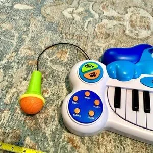 • The toy includes a built-in microphone for sing-alongs and a record-and-play mode for creating original songs.