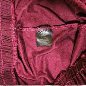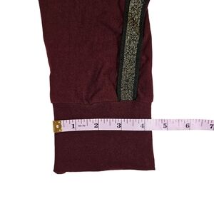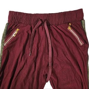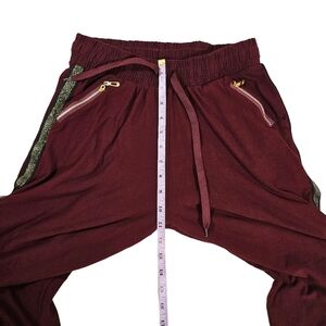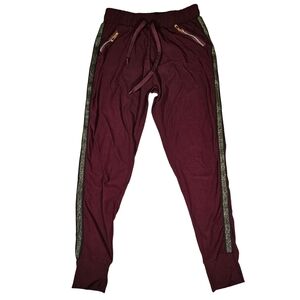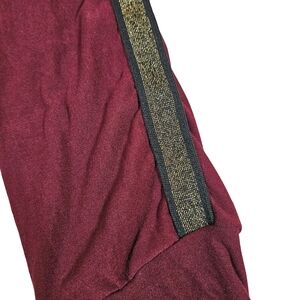 Excellent Like New Condition, Super Soft Buttery Fabric, Elastic Waistband With Drawstring, Beautiful Dark Burgendy, Gold Zipper Pockets, Black/Gold Stripe Down Both Legs, Tapered Leg With Elastic Hem At Ankle