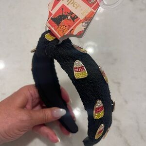 Chic black headband featuring vibrant candy corn details. Ideal for a festive look. Cute and comfortable w top knot! New