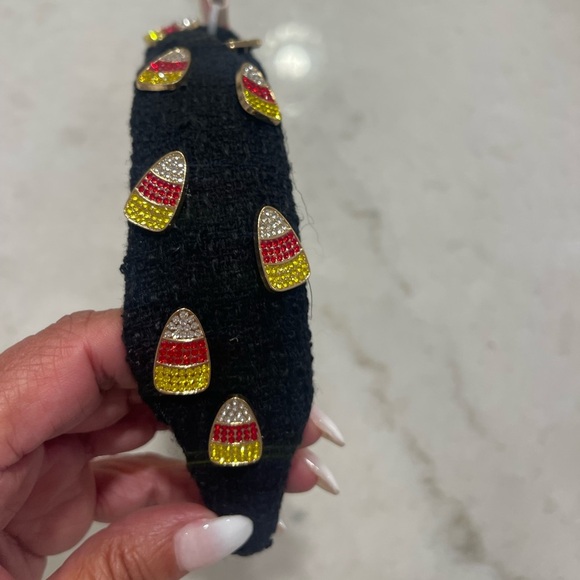 Chic black headband featuring vibrant candy corn details. Ideal for a festive look. Cute and comfortable w top knot! New