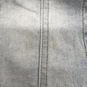 This Sparkle Denim Pearl and Grommet light wash denim jacket features grommets, faux pearls, and rhinestones on the front and back shoulders and left wrist. None of the stones appear to be missing, some of them hang more loosely, which can be seen in the closeup of the sleeve.