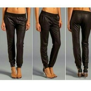 Black faux leather pants with elastic waistband and ankle cuffs. Pants have 2 slit pockets and pleated at the waistband