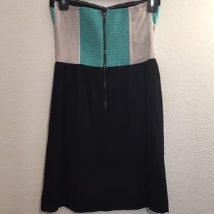 This dress comes with rubber bands to help keep it from falling. It has a zipper in the back. The pleats in the back allow for lots of stretch. Turquoise, light gray and black.